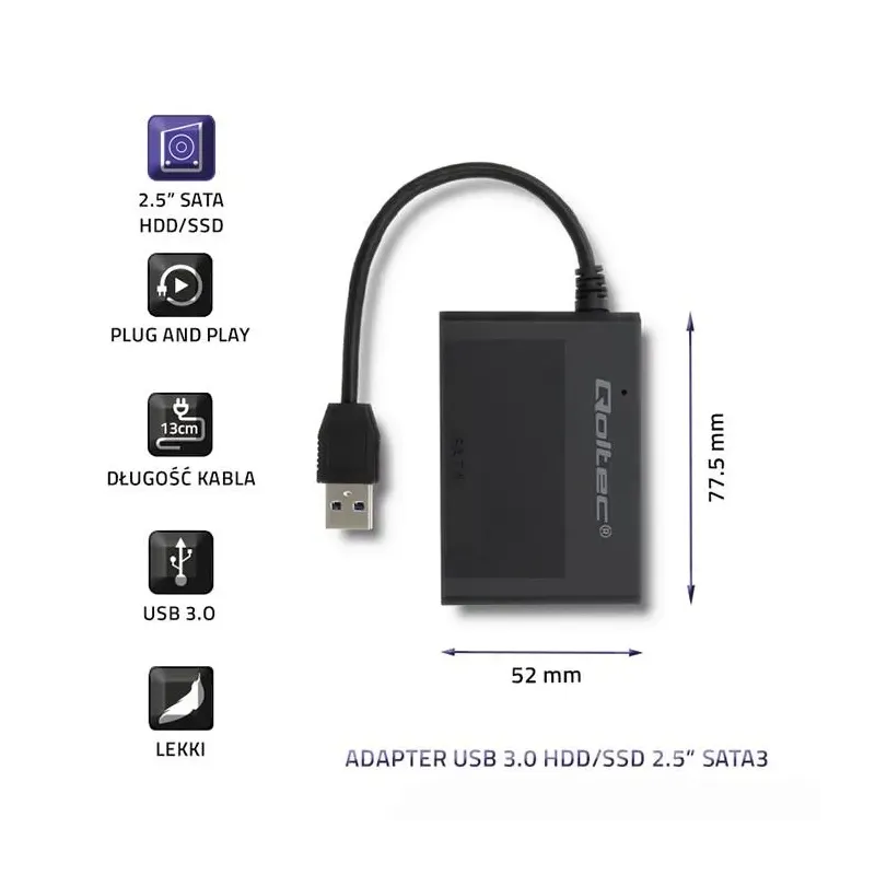 Obsługiwane systemy: Android 4.0 i wyżej, Windows 2000, 2003, XP, Vista, Windows 7, Windows 8/10, Mac 10.5 i wyżej Typ obudowy: zewnętrzna Standard: USB 3.0 oraz SATA 3.0 Długość kabla: 0,13m Materiał: Tworzywo sztuczne Kolor: Czarny Wymiary: 77 x 52.5 x 15.6 mm Waga: 32 g