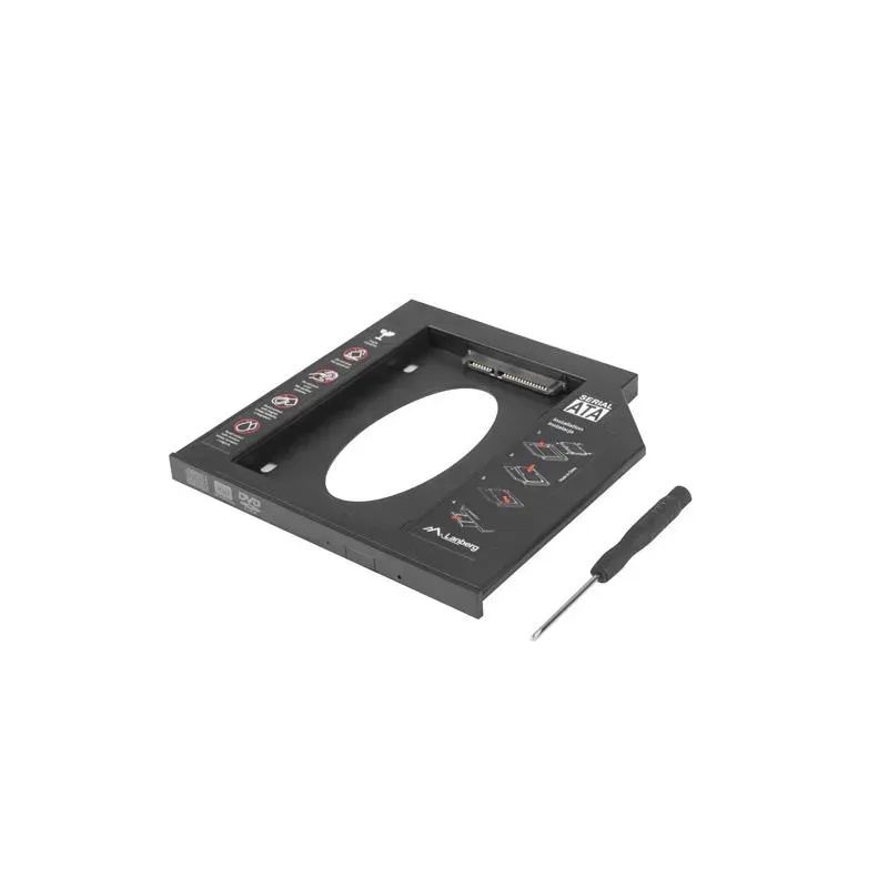 Obudowa przeznaoczna na dysk 2,5" HDD lub SDD, pozwala na zamontowanie dodatkowego dysku w miejscu laptopowej stacji dysków do wysokości 12,7mm. Zdejmowana klapka z przodu obudowy pozwala na założenie fabrycznej zaślepki od stacji CD co powoduje, że obudowa nie przeszkadza w codziennym użytkowaniu - Do montażu w zatokach slim 5,25" do wysokości 9,5mm - Odpowiednia dla dysków 2,5" SATA SDD/HDD do wysokości 7mm - Plug&Play - Do pracy nie wymaga sterowników - Śrubokręt i śrubki w zestawie