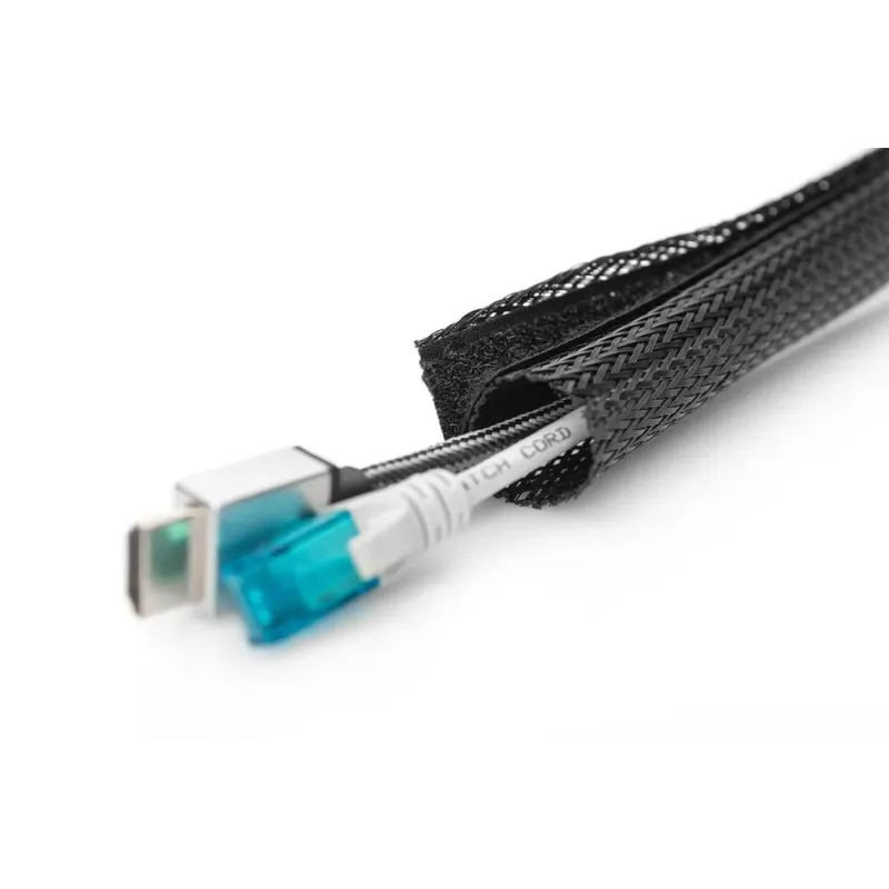Elastyczny przewód kablowy z rzepem jest uzupełnieniem do zarządzania kabl. Możliwość elastycznego przycinania na wymiar, samozacisk. zapięcie na rzep Możliwość ponownego zapięcia aby dodać nowe lub usunąć pojedyncze kable Wąż kablowy pasuje do wiązek kablowych o średnicy do 5 cm Długość: 2 m Średnica: 2 – 5 cm Wymiary po otwarciu: Dł. 200 × szer. 8,5 × wys. 0,3 cm