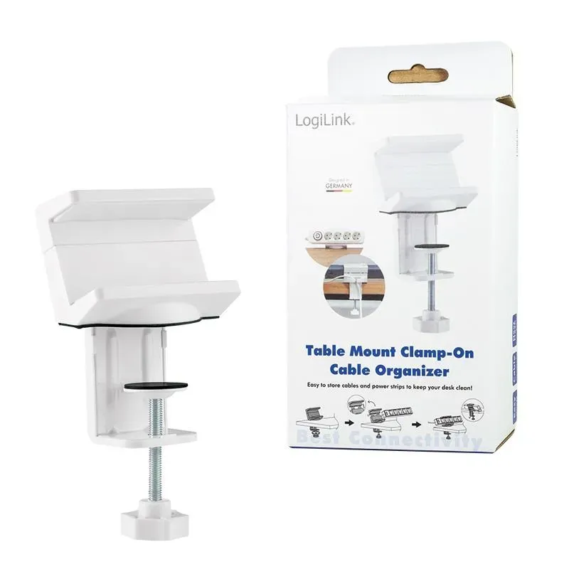 Zaprojektowany do montażu na krawędzi biurka lub półki Regulowana szerokość od 50-70 mm Silikonowe podkładki zapewniają pewny chwyt taśmy Podkładki z pianki EVA chronią powierzchnie przed zadrapaniami Zacisk na powierzchniach o grubości do 50 mm Materiał: ABS, stal, żel krzemionkowy Wymiary: 100 x 62 x 163 mm