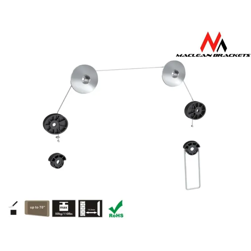 Ultra-płaski uchwyt do telewizora Odległość TV od ściany 14,5 mm Regulacja za pośrednictwem linki stalowej Montaż na dowolnej ścianie drewnianej oraz betonowej Łatwe podłączenie przewodów po zawieszeniu telewizora Bardzo wysoka jakość wykonania Wykonany z wysokogatunkowej stali oraz tworzywa VESA 100x100, 200x200, 300x300, 400x400, 600x600, 800x800 Maksymalne obciążenie: aż 50 kg