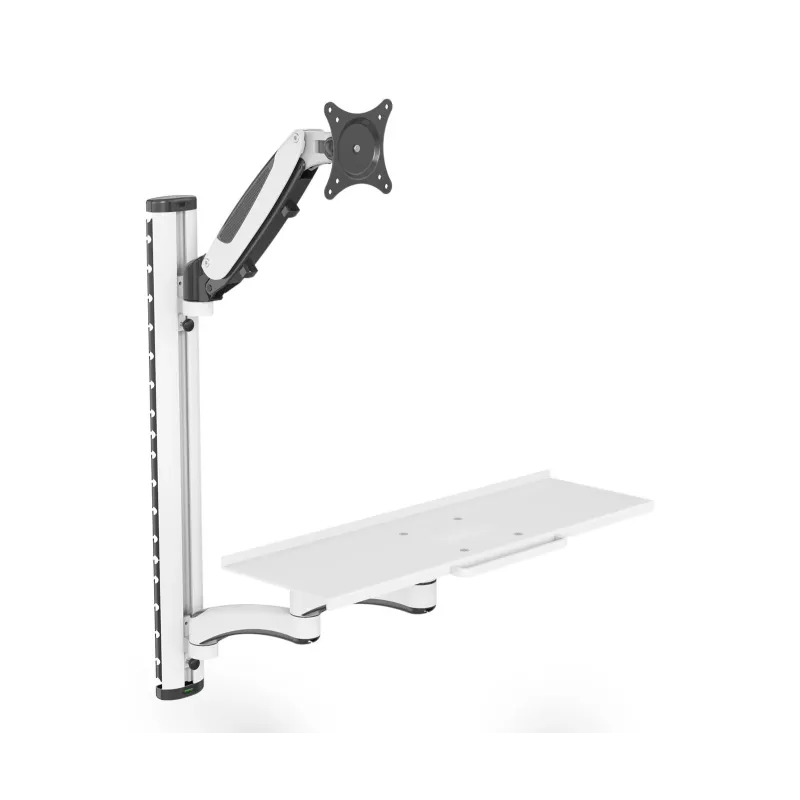 Ramię monitorowe (sprężyna gazowa) – regulacja kąta nachylenia 45° możliwość obrotu o 180°, uchwyt VESA z możliwością obrotu o 360° Ramię monitorowe odpowiednie do monitorów o przekątnej ekranu do 32” i maks. wadze 8 kg (VESA 75x75, 100x100) Uchwyt na klawiaturę i mysz (podwójne ramię przegubowe) – wymiary: szer. 60 cm x gł. 17,8 cm i uchwyt z przodu Podwójne ramię przegubowe o maksymalnej nośności 8kg - możliwość obrotu o maks. 180° Możliwość indywidualnej regulacji wysokości obu ramion na uchwycie nośnym (wysokość 73 cm) Prosty montaż ścienny za pomocą trzech połączeń śrubowych Wysokiej jakości konstrukcja z aluminium/stali