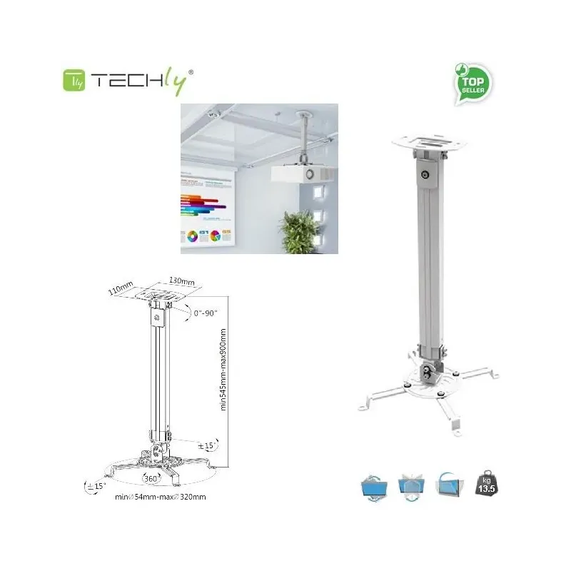 Max.udźwig: 13,5 kg Regulacja długości: 55-90 cm Regulacja kąta nachylenia: +/- 15° Regulacja obrotu: 360° Regulacja kąta pochylenia względem płaszczyzny sufitu: +/- 90° Min.rozstaw (średnica) nóżek mocujących: 54mm Max. rozstaw (średnica) nóżek mocujących: 320mm Wymiary sufitowej płyty mocującej: 110x130mm Materiał: Stal / aluminium Waga: 1,766 kg Kolor: srebrny Opis produktu: Umożliwia bezpieczny montaż sufitowy większości typów projektorów Konstrukcja ze stali oraz wytrzymałego aluminium gwarantuje maksimum bezpieczeństwa Uniwersalna nóżki mocujące umożliwiają zastosowanie uchwytu z większością projektorów Możliwość regulacji długości Możliwość regulacji kąta pochylenia Możliwość montażu na pochyłych sufitach Możliwość regulacji obrotu w płaszczyźnie poziomej Zintegrowany system organizacji przewodów Idealny do zastosowania w domu, w biurze oraz do instalacji komercyjnych Zawartość opakowania: Uchwyt sufitowy do projektora Elementy montażowe Instrukcja użytkownika