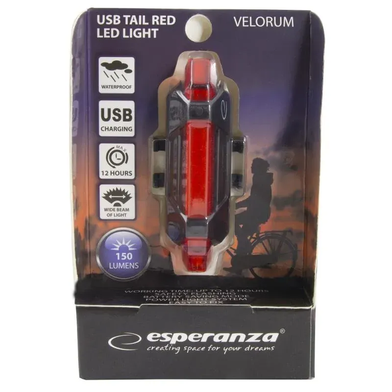 Lampka rowerowa tylna USB Esperanza VELORUM posiada 5 mocnych diod LED. Diody emitują silne, czerwone światło o strumieniu 150 lumenów. Urządzenie dysponuje 5 trybami świecenia. Lampka posiada wbudowaną baterię i jest ładowana przez przewód USB. Zestaw zawiera: lampkę, kabel USB, 2 krążki do montażu. Materiał: tworzywo sztuczne Zasilanie: wbudowany akumulator 500mAH Do przymocowania lampki nalezy użyć z 2 załączonych, elastycznych krążków. Zaczepić za uchwyt z jednej strony lampki. Owinąć dookoła ramy i zaczepic za uchwyt z drugiej strony lampki. Aby wybrać jeden z trybów świecenia lub wyłączyć urządzenie, należy przycisnąć i przytrzymać włącznik, umieszczony na froncie lampki.