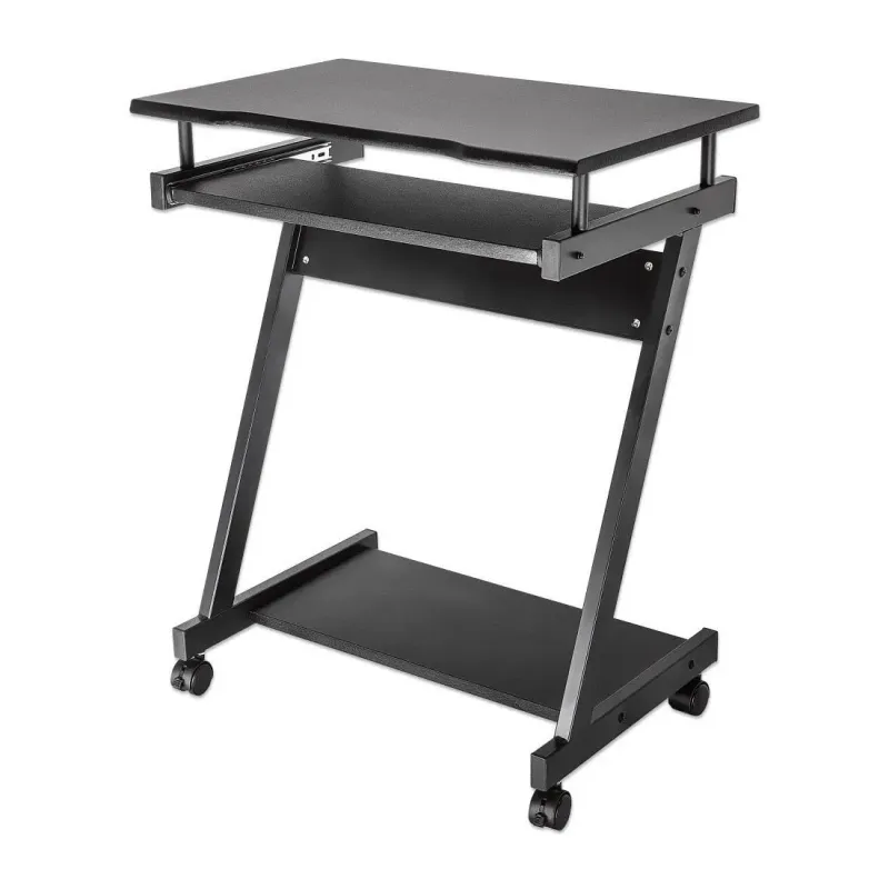 Parametry techniczne: Typ biurka: komputerowe, na kółkach Przeznaczenie: dom, biuro, pracowania Wymiary: Blat główny: 590 x 370 mm Półka na klawiaturę: 490 x 200 mm Dolna półka: 510 x 240 mm Wysokość całkowita: 730 mm Materiał wykonania: Blaty: laminowana płyta MDF Rama: stal Kolor: czarny Dopuszczalne obciążenie: 30 kg Bardzo szybki i prosty montaż
