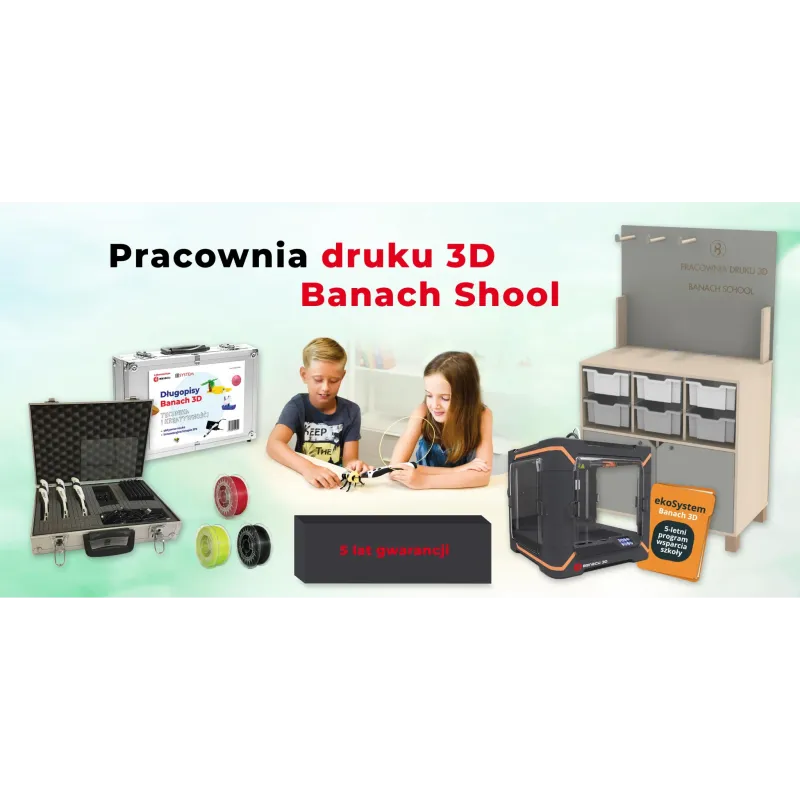 Certyfikaty: CE, FCC, ROSH, REACH Technologia: FDM Stół roboczy: wymienny Łączność: WI-FI, USB, karta SD Prędkość druku - szybka: 20-120 mm/s Oprogramowanie: TinkerCAD, Fusion360, Onshape, CURA, Simplify3D Obsługiwane typy plików: .STL, .OBJ kompatybilny z drukarką slicer Pracownia druku 3D Banach składa się z: -drukarka Banach School 3D z 5-letnim pakietem dydaktycznym -stolik na drukarkę 3D z akcesoriami -długopisy 3D Banach (zasilane na baterie) - 12 sztuk -filament (PLA biodegradowalny) – 16kg -kompleksowy system uruchomienia oraz wdrożenia druku 3D - przez 5 lat