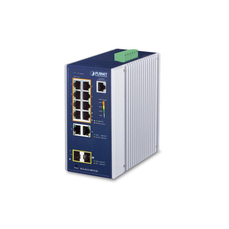 Zaprojektowany do instalacji w ciężkich warunkach przemysłowych, IGS-4215-8P2T2S jest nowym członkiem rodziny PLANET Industrial-grade, typu DIN-rail L2/L4 Managed Gigabit PoE+ Switch z inteligentnymi funkcjami PLANET PoE, aby poprawić dostępność krytycznych aplikacji biznesowych. Zapewnia zarządzanie podwójnym stosem IPv6/IPv4 i wbudowany silnik przełączania L2/L4 Gigabit wraz z 8 portami 10/100/1000BASE-T z 36-watowym 802.3at PoE+, 2 dodatkowymi gigabitowymi portami miedzianymi i kolejnymi 2 dodatkowymi slotami światłowodowymi 100/1000BASE-X SFP do przesyłania danych i wideo. IGS-4215-8P2T2S jest w stanie pracować niezawodnie, stabilnie i cicho w każdym utwardzonym środowisku bez wpływu na jego wydajność. Posiada całkowity budżet mocy do 240 watów dla różnych rodzajów aplikacji PoE i temperaturę pracy od -40 do 75 stopni C w wytrzymałej metalowej obudowie IP30.