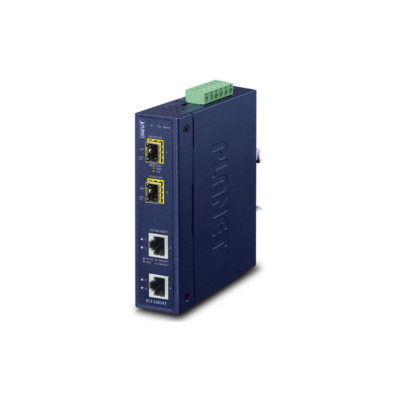 PLANET IGT-2205AT to przemysłowy gigabitowy konwerter mediów zapewniający wydajność bez blokowania prędkości transmisji i dużą elastyczność przy rozszerzaniu sieci Gigabit Ethernet w trudnych warunkach przemysłowych. Urządzenie jest wyposażone w dwa porty miedziane 10/100/1000BASE-T RJ45 oraz dwa interfejsy światłowodowe 100/1000/2500BASE-X SFP i jest umieszczone w wytrzymałej obudowie o klasie szczelności IP30 z redundantnym systemem zasilania. Przełącznik IGT-2205AT doskonale nadaje się do wdrażania systemów nadzoru oraz zabezpieczania kontroli i usług bezprzewodowych w wymagających środowiskach o szerokim zakresie temperatur od -40 do 75 stopni Celsjusza.