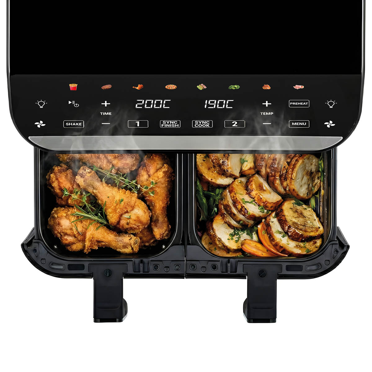 - Funkcje: Sync Cook, Sync Finish, Preheat, Shake Reminder, automatyczne wznowienie pracy