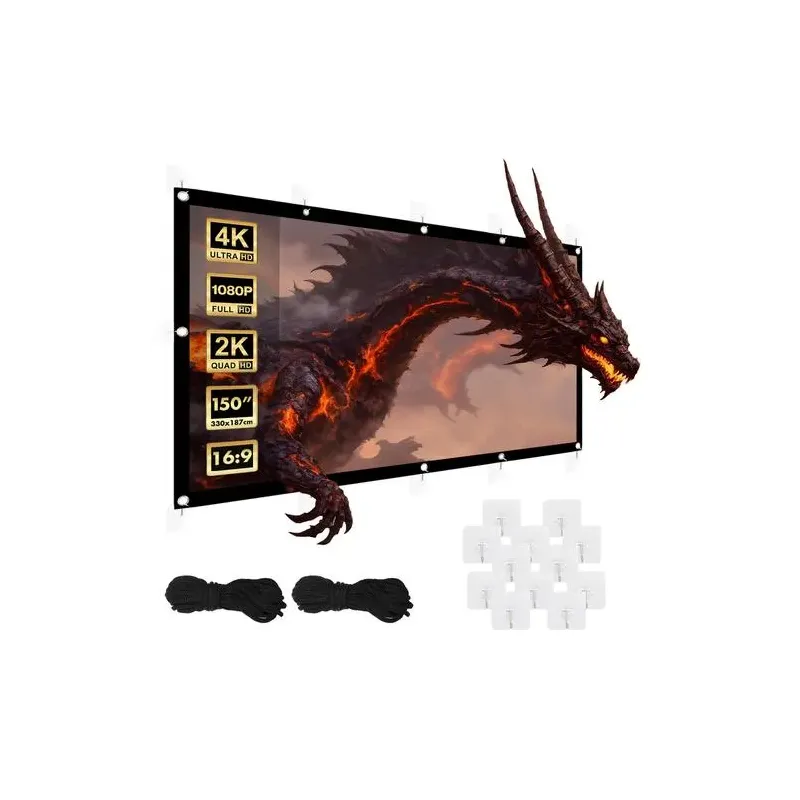 Idealny do aplikacji edukacyjnych, prezentacji handlowych, urządzenia kina Matowy, biały materiał ekranu jest trwały i łatwy do czyszczenia najwyższej jakości reprodukcji barw Szeroki kąt widzenia 179° Przekątna 150" Materiał wykonania: poliester o dużej gęstości Współczynnik wzmocnienia: < 1.2 Liczba otworów montażowych: 12 Długość linek: 5 m
