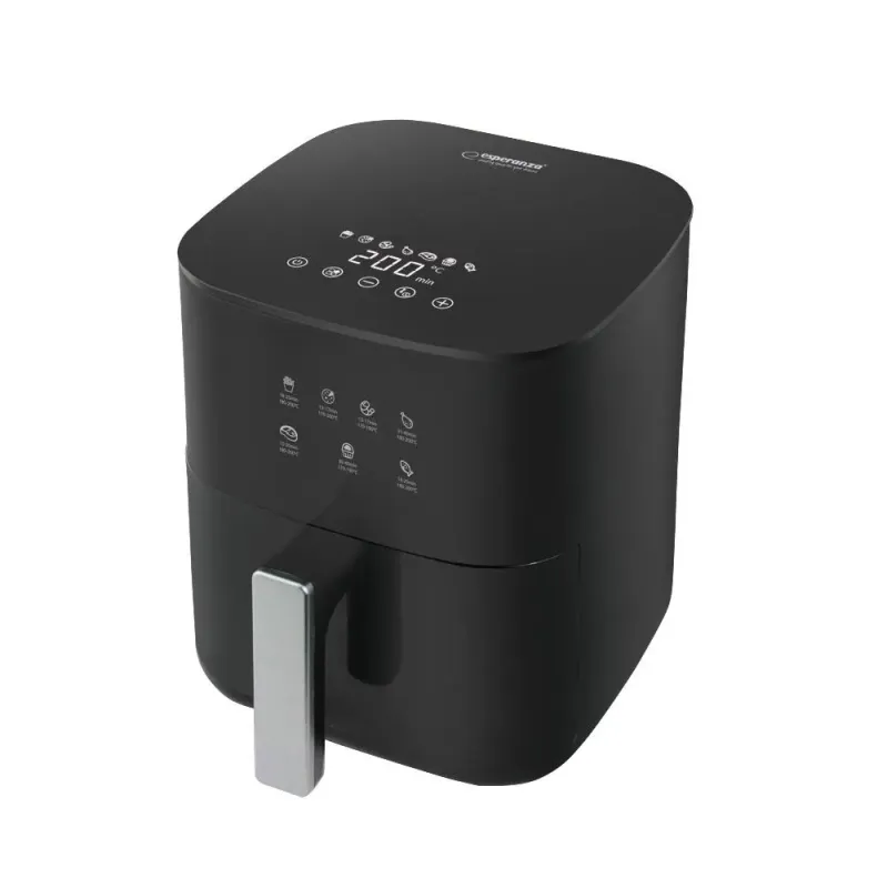 Frytkownica beztłuszczowa Esperanza PATATE FRITTE to idealne rozwiązanie dla osób, które pragną cieszyć się smakiem smażonych potraw w zdrowszej wersji. Urządzenie pozwala przygotować chrupiące frytki, soczystego kurczaka czy aromatyczne warzywa bez użycia tłuszczu – szybko, wygodnie i bez kompromisów w smaku. Dzięki wysokiej mocy i cyrkulacji gorącego powietrza potrawy są równomiernie opiekane, a ich przygotowanie zajmuje zaledwie kilka minut. Nowoczesny wygląd urządzenia sprawia że doskonale prezentuje się w każdej kuchni, a intuicyjny panel sterowania z 7 gotowymi programami ułatwia obsługę. Regulacja temperatury i minutnik dają pełną kontrolę nad procesem pieczenia a dzięki antypoślizgowym nóżkom urządzenie stoi stabilnie na blacie. To funkcjonalne i praktyczne urządzenie, które pokochają wszyscy domownicy ZDROWSZE SMAŻENIE BEZ OLEJU 7 AUTOMATYCZNYCH PROGRAMÓW NOWOCZESNY DESIGN I PROSTA OBSŁUGA Zakres napięcia znamionowego: 220-240 V Częstotliwość znamionowa: 50/60 Hz Stopień ochrony: I Pobór mocy: 1350 W Minutnik: 0 - 60 minut Temperatura: 80°C - 200°C Nóżki gumowe antypoślizgowe Pojemność pojemnika do smażenia: 3.5 l Długość kabla zasilającego (widoczna): 90 cm Wymiary produktu (dł. x szer. x wys.): 30.5 x 23.0 x 26.5 [cm] Wymiary panelu sterowania (dł. x szer.): 9.5 x 5.0 [cm] 7 gotowych menu (frytki / pizza / krewetki / kurczak / stek / ciasto / ryba