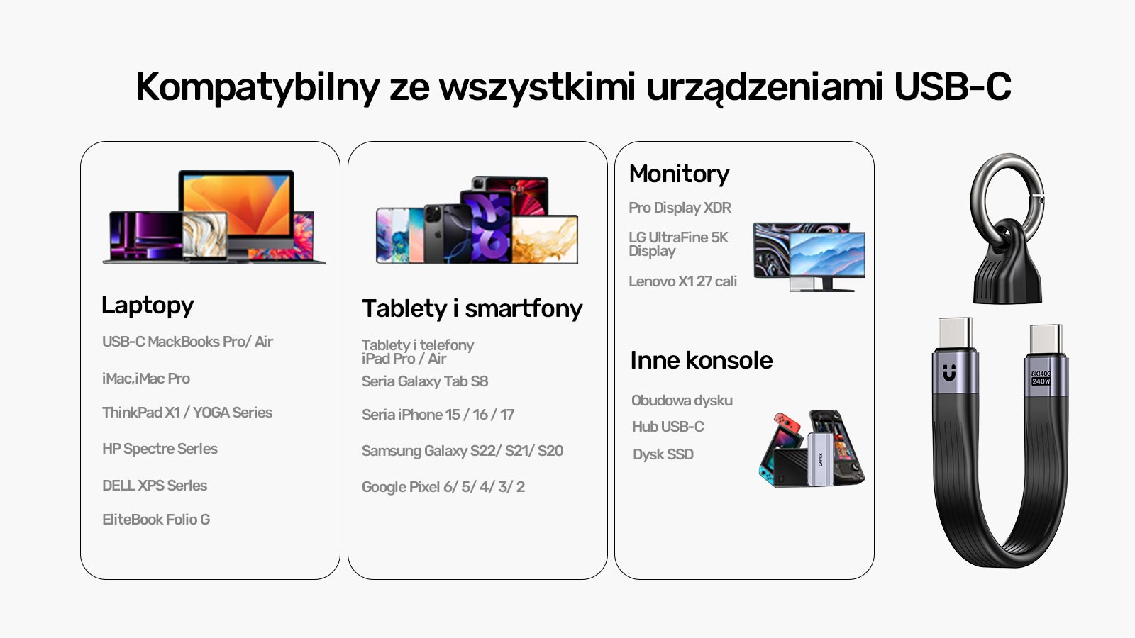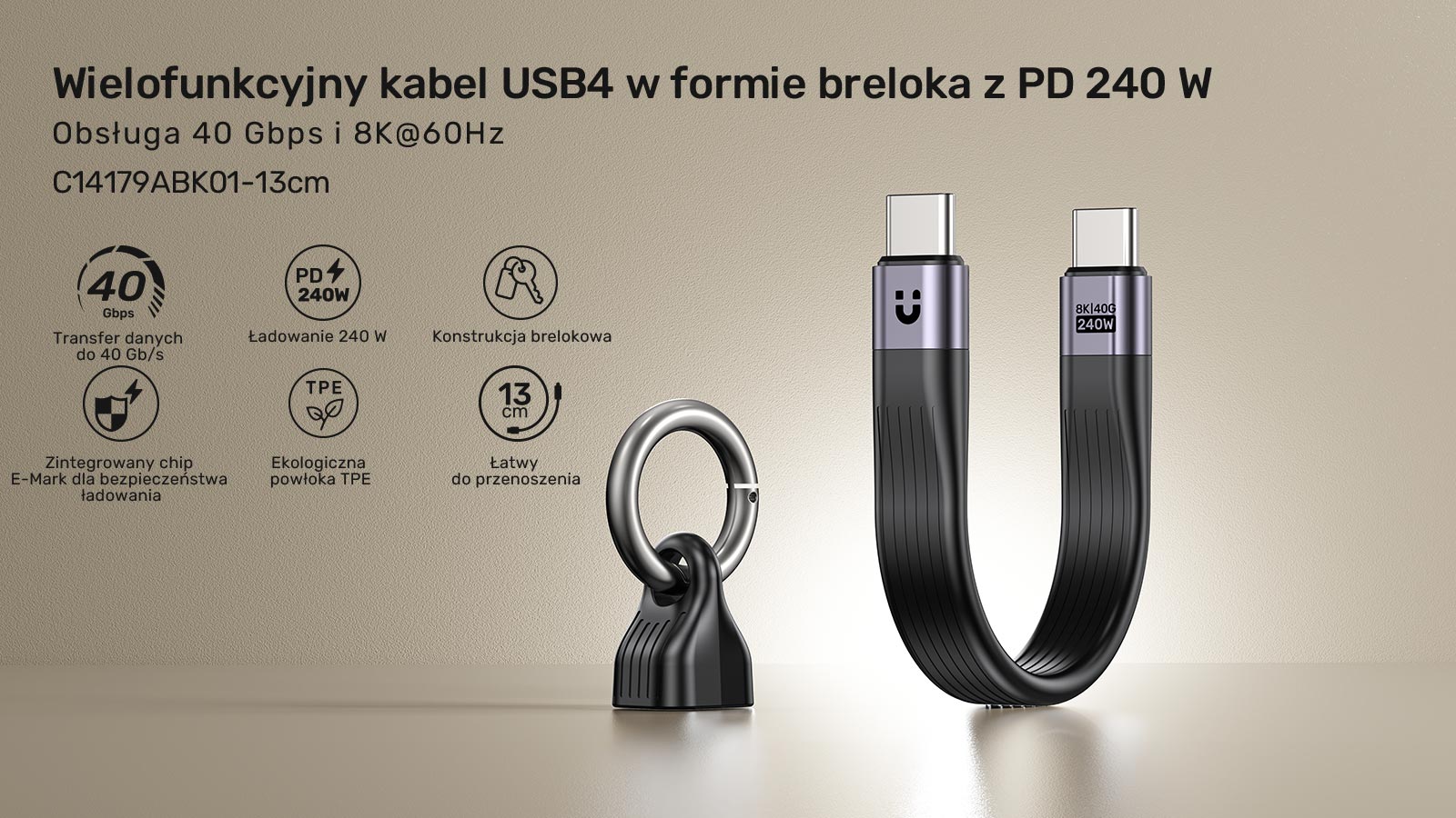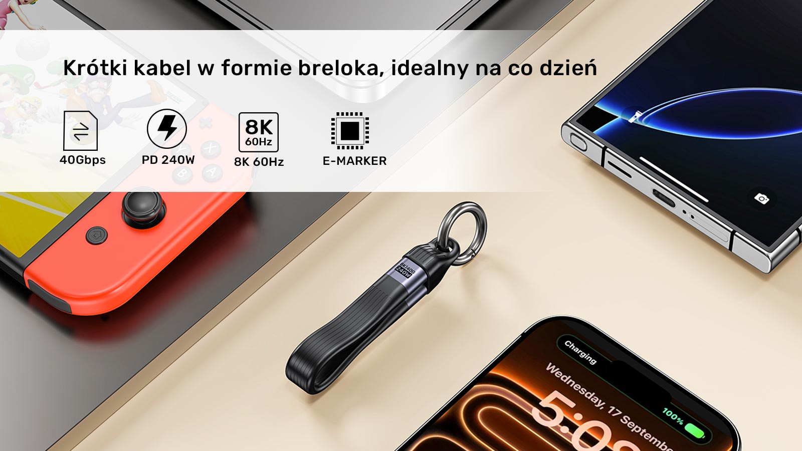Kabel USB-C w formie breloka, który rozwiązuje jeden z najczęstszych problemów w pracy z elektroniką – brak kabla wtedy, gdy jest potrzebny. Mimo kompaktowego rozmiaru oferuje pełną funkcjonalność USB4: szybki transfer danych, wysoką moc ładowania i obsługę obrazu.