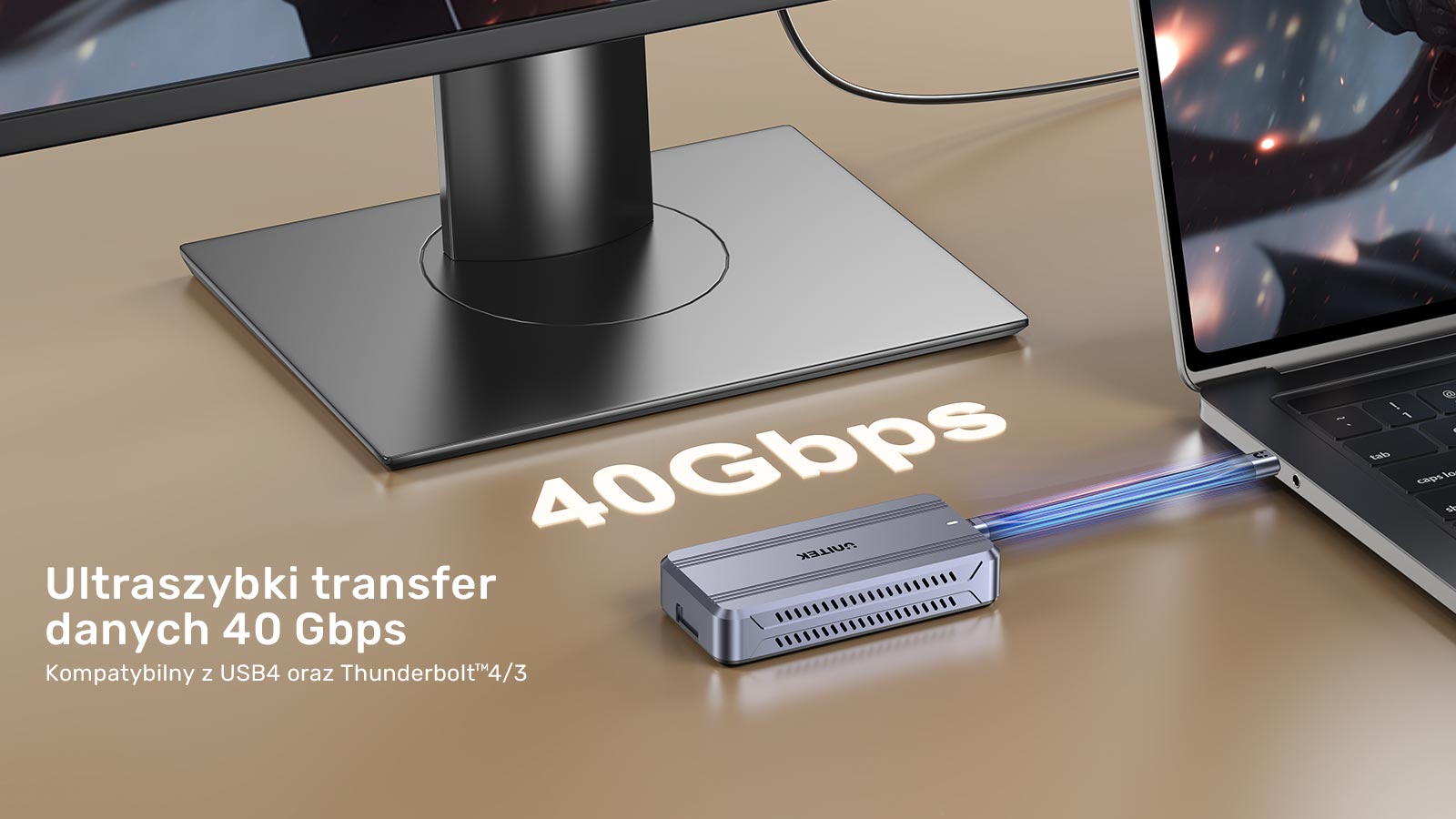 Transfer do 40 Gb/s ma realne znaczenie przy pracy z dużymi plikami – backupami, materiałami wideo czy projektami graficznymi. To poziom wydajności, który skraca czas operacji i pozwala płynnie pracować na nowoczesnym sprzęcie. Kompatybilność z Thunderbolt 4 dodatkowo upraszcza środowisko pracy.