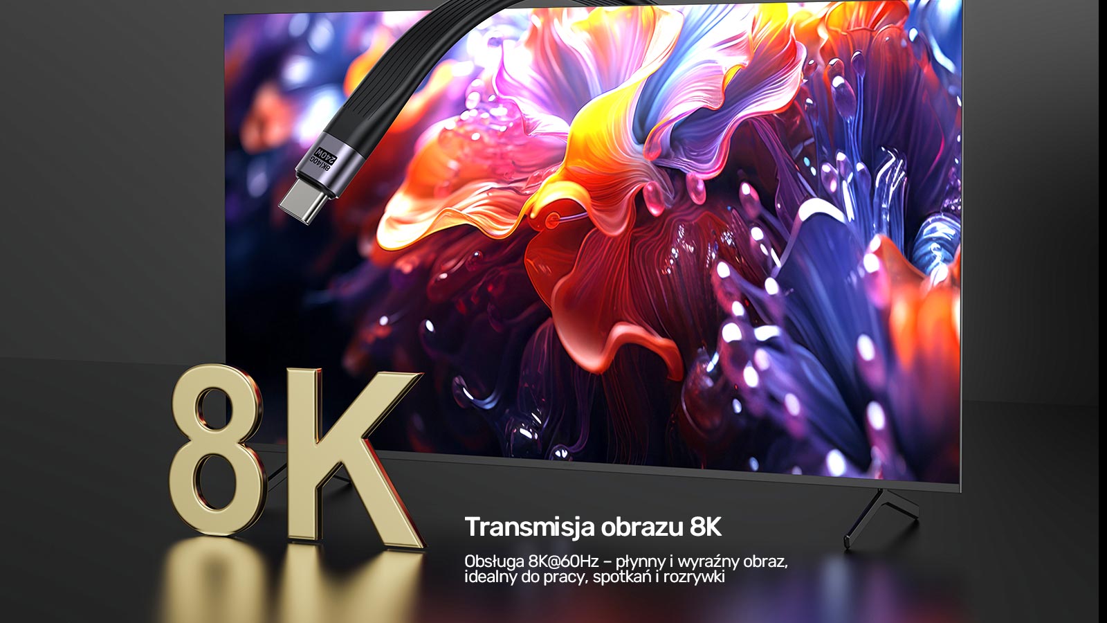 - Obsługa obrazu 8KKabel umożliwia podłączenie monitora lub projektora w wysokiej rozdzielczości.