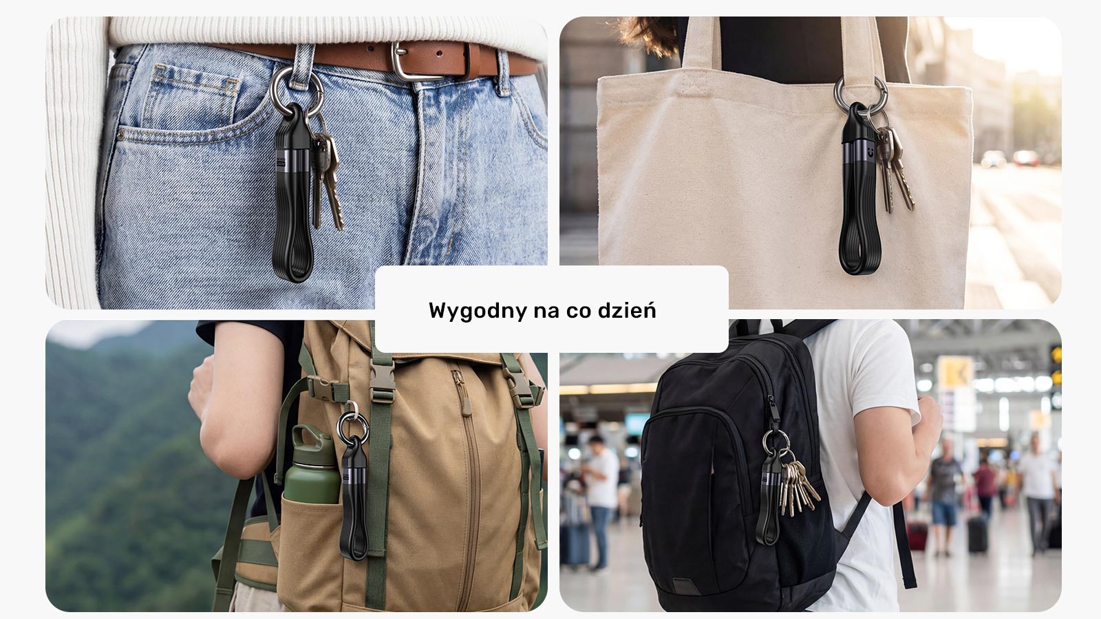 Największą przewagą tego modelu jest forma. Kabel w formie breloka nie trafia do szuflady – jest przypięty do kluczy i dostępny od razu. To kabel, którego po prostu nie zapomnisz zabrać. W praktyce oznacza to mniej sytuacji, w których nie masz czym podłączyć urządzenia – w biurze, u klienta czy w podróży.