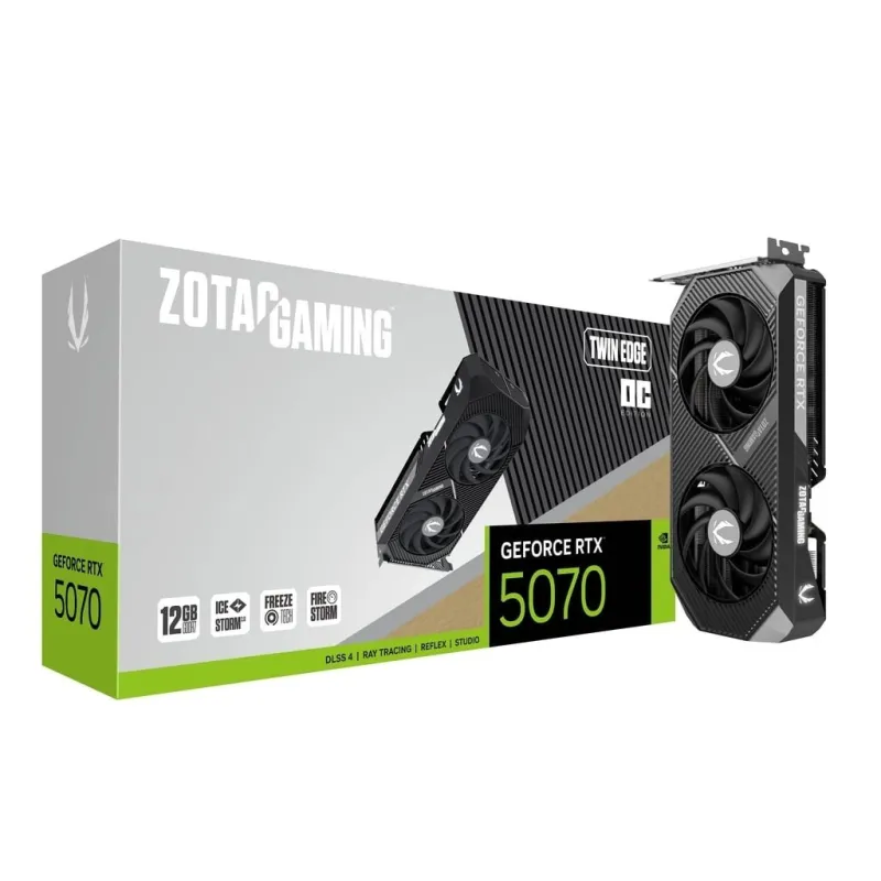ZOTAC GAMING GeForce RTX 5070 Twin Edge OC to kompaktowa karta graficzna oparta na nowoczesnej architekturze NVIDIA Blackwell, wyposażona w DLSS 4 oraz 12 GB pamięci GDDR7. Mimo niewielkich rozmiarów, model Twin Edge OC jest wydajny i gotowy, aby sprostać zarówno grom, jak i zadaniom związanym ze sztuczną inteligencją.