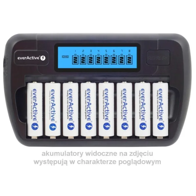 Szybkie ładowanie dużej ilości akumulatorów jednocześnie Detekcja ogniw uszkodzonych i alkalicznych Tryby pracy: charge (ładowanie), discharge (rozładowanie/odświeżanie) Wyświetlacz LCD czytelny z niebieskim podświetleniem Graficzne wskazanie poziomu naładowania każdego ogniwa z osobna Zasilanie: 100-240V AC / 12 V DC 1000 mA Proces ładowania sterowany mikroprocesorem z detekcją -dV Obsługiwane akumulatory 1-12szt. R03 AAA /R6 AA,Ni-MH o dowolnej pojemności Prąd ładowania: AA 8x 500 mA max, AAA 8x 250 mA max Prąd rozładowania 70-700 mA w zależności od ilości i typu ogniw Zabezpieczenie przed przegrzaniem akumulatorów Zabezpieczenie przed przeciążeniem/zwarciem Podświetlany wyświetlacz LCD z wskaźnikiem ładowania baterii Posiada funkcję odświeżania (rozładowania) akumulatorków na żądanie Ładowarka posiada zabezpieczenia przed zwarciem, błędnym włożeniem ogniw