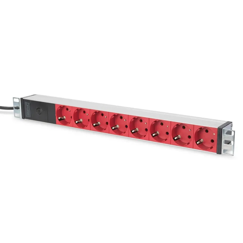 Idealne rozwiązanie do szafy sieciowej lub serwerowej 19 ” 8x czerwone gniazdo wtykowe 250V AC50/60Hz / 10A/2500W Gniazda wtykowe ze stykiem ochronnym obrócone o 35° Bezpieczeństwo dzięki podwójnie uziemionej wtyczce z zestykiem ochronnym Przewód H05VV-F 35 1,5mm2 o długości 2m z wtyczką C14 2x profil kątowy do montażu w szafie Komponenty plastikowe z ABS UL-94V-0 Uziemienie na profilu aluminiowym Zabezpieczenie wstępne Profil aluminiowy