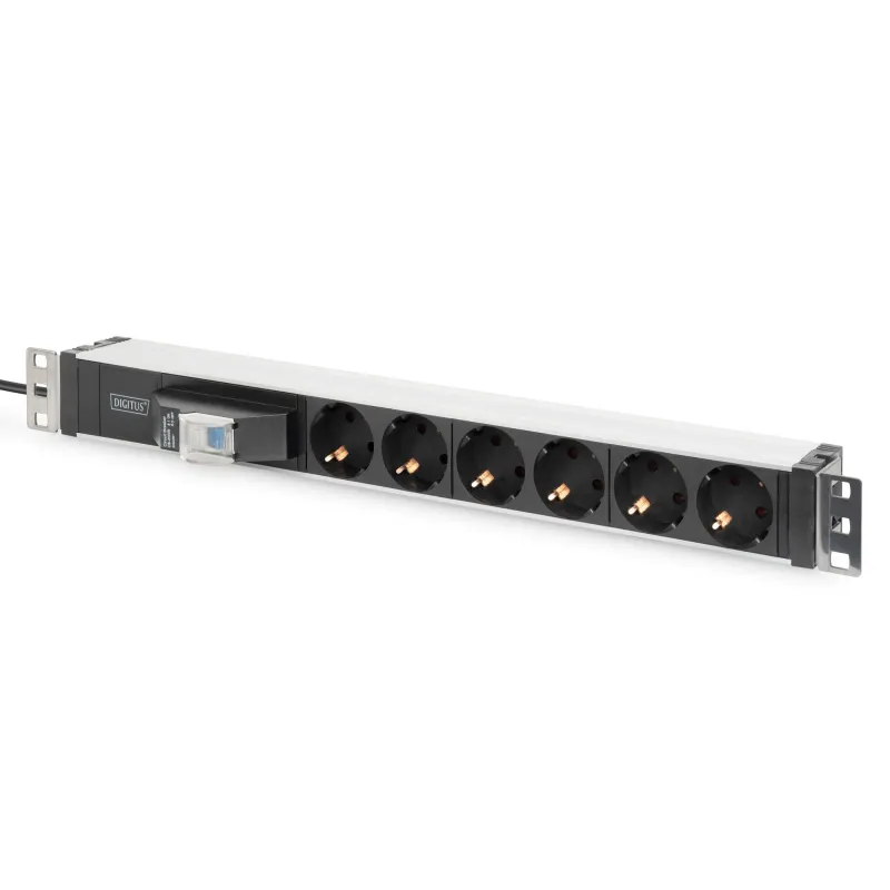 Idealne rozwiązanie do szafy sieciowej lub serwerowej 19” Profil aluminiowy Rozmieszczenie gniaz. 45°, brak blokowania lub zakrywania sąsiednich gniazd Wyłącznik nadmiarowo-prądowy: Zabezpieczenie 4000W Przewód sieciowy z wtyczką z zestykiem ochronnym: 2 m, 3G x 1,5 mm2 Kątowniki mocujące mogą być umieszczane w 8 położeniach, pod kąt. 90° i 45°