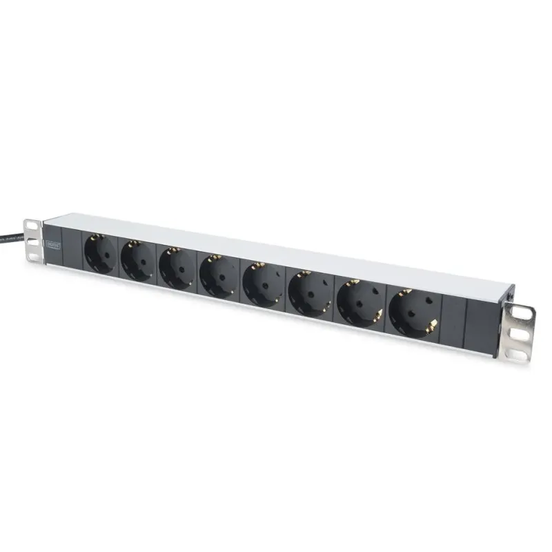 Idealne rozwiązanie do szafy sieciowej lub serwerowej 19 ” Uziemienie na profilu aluminiowym Wtyczka schuko Podwójne metalowe mocowanie w komplecie Przewód H05VV-F 35 1,5mm2 o długości 2m z wtyczką ze stykiem ochronnym Gniazda wtykowe ze stykiem ochronnym obrócone o 35°