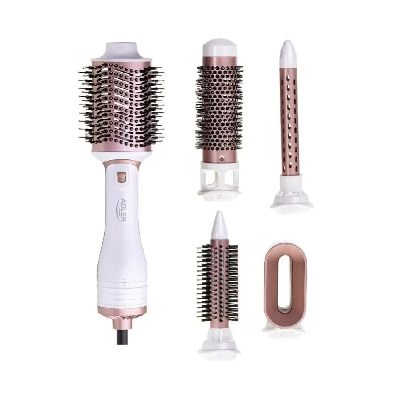 2 stopnie ustawienia temperatury Zimny nawiew 5 wymiennych nasadek: - okrągła szczotka o średnicy 21mm - okrągła szczotka o średnicy 38mm - duża szczotka o średnicy 72mm - lokówka o średnicy 19mm - suszarka Szczotki z włosiem nylonowym Nasadki z powłoką ceramiczną Zdejmowalny filtr Ochrona przed przegrzaniem Przewód obrotowy Uchwyt do zawieszenia Kolor przewodu: czarny Rozmiar urządzenia (bez nasadek): długość 20cm x szerokość 6.4cm Kolor urządzenia: perłowy biały, różowe złoto