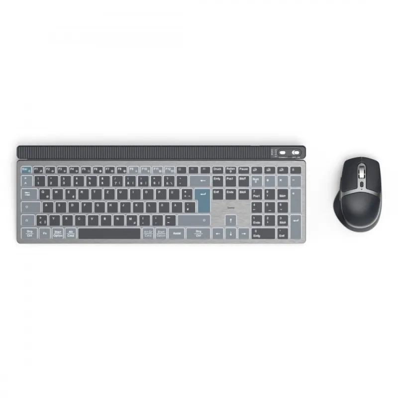 Zestaw bezprzewodowy Hama WKM-750, wykonany z aluminiowych komponentów, oferuje wszechstronną łączność multi-device, umożliwiając jednoczesne podłączenie do trzech urządzeń (1 USB, 2 Bluetooth) i szybkie przełączanie między nimi za pomocą przycisku. Stabilne połączenie 2,4 GHz oraz Bluetooth 5.2 zapewnia swobodę użytkowania na odległość do 10 metrów.