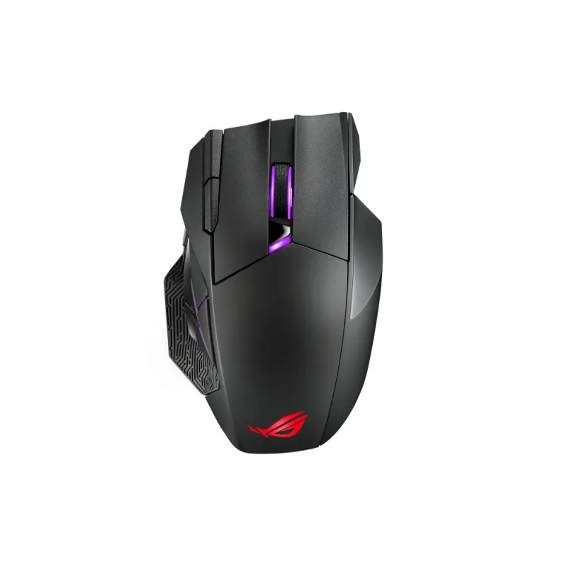 Bezprzewodowa mysz do gier z łącznością w dwóch trybach (przewodowa / 2,4 GHz) z magnetyczną podstawką ładującą, 12 programowalnymi przyciskami, specjalnie dostrojonym czujnikiem ROG 19.000 dpi, ekskluzywnymi gniazdami przełączników Push-Fit, mikroprzełącznikami ROG, ROG Paracord i oświetleniem Aura Sync RGB