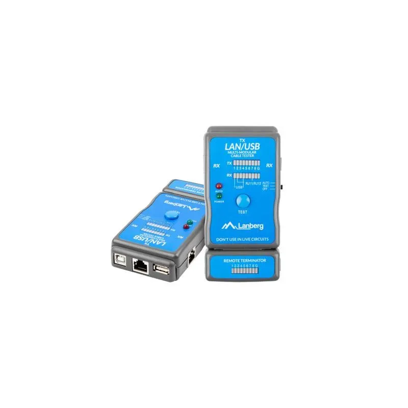 TESTER KABLI RJ-45, RJ-11, USB – bez baterii Ten tester został zaprojektowany aby łatwo i szybko sprawdzić czy dany kabel jest sprawny (za pomocą testowania jego pinów). Kable, które można testować: - USB (A/A, A/B); - BNC 10-100-1000Base-TX; - Coaxial; - RJ45; - RJ11/RJ12 (adaptery dodane do zestawu w miejscu przeznaczonym na baterię)