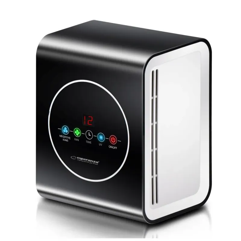 Zakres napięcia znamionowego: 220-240 V Częstotliwość znamionowa: 50/60 Hz Pobór mocy: 10W CADR (wydajność oczyszczania powietrza): 30 m3/h Zastosowanie w pomieszczeniach o powierzchni: 10-20 m2 Ilość jonów ujemnych: 12 milionów / cm3 Filtr 3-stopniowy:wstępny+wysokowydajny HEPA+filtr z węglem aktywnym Sposób oczyszczania powietrza: Filtr 3-stopniowy + generator jonów ujemnych + lampa bakteriobójcza UV Skuteczność filtra HEPA: 99,7% Duży wyświetlacz LCD z przyciskami dotykowymi Wentylator z dwoma prędkościami Sterowanie czasowe: 1 – 12 godzin Hałas ? 45db Długość kabla: 1.5 m Wymiary filtra: 15,5 x 15,5 x 2,5 [cm] Zaawansowany filtr zatrzymuje aż do 99,7% zanieczyszczeń:alergenów,kurzu. Wchłania formaldehyd, benzen, ksylen oraz inne szkodliwe gazy. Wbudowana lampa UV eliminuje bakterie, roztocza, wirusy i grzyby. Jony ujemne łączą się z dodatnio naładowanymi cząstkami pyłu i dymu. Dzięki temu zabijają bakterie i wirusy. Oczyszczacz powietrza Esperanza to nowoczesne urządzenie. Zapewni idelanie czyste i świeże powietrze w Twoim domu.