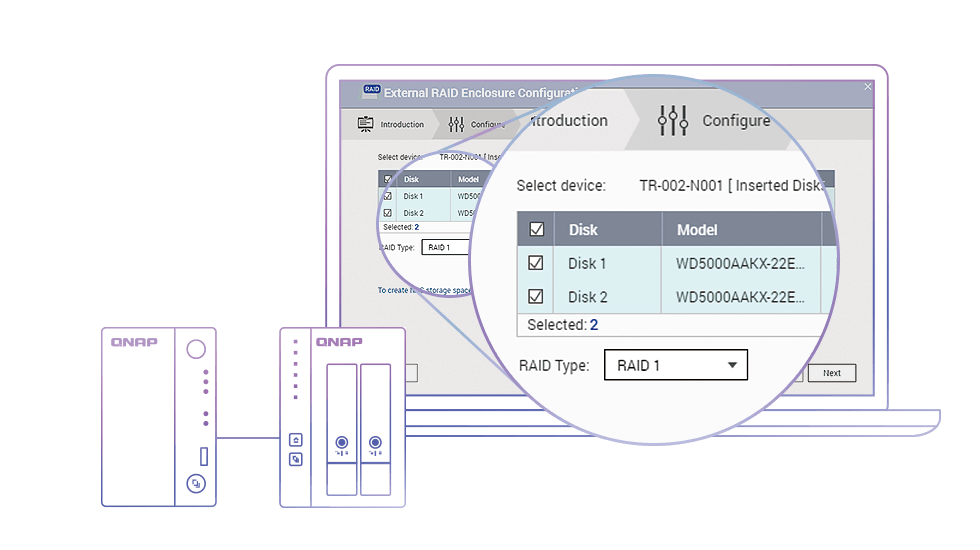 W odróżnieniu od wielu innych obudów RAID model TR-002 umożliwia programowe sterowanie konfiguracją, co daje maksymalną elastyczność zarządzania. Do konfigurowania macierzy RAID i monitorowania kondycji dysków można używać Menedżera pamięci masowej i migawek na serwerze QNAP NAS lub narzędzia QNAP External RAID Manager na komputerze.