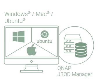 Możesz uzyskać ochronę danych, tworząc software RAID 0, RAID 1 i RAID 5 przy użyciu natywnego narzędzia w komputerach z systemem Windows® i Ubuntu®, a dzięki narzędziu QNAP JBOD Manager monitorować informacje o stanie TL-R1200C-RP.