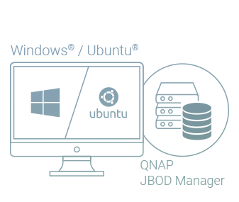 Łatwa obsługa. QNAP NAS i komputer PC mogą przy użyciu dedykowanego oprogramowania monitorować i pobierać informacje o JBOD, i nimi zarządzać.