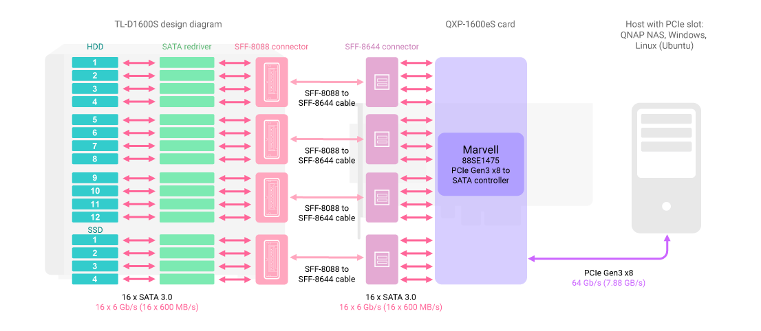 Model TL-D1600S oferuje łączność SFF-8088 (lub SFF-8644) i wiele wnęk SATA 6 Gb/s. Pozwala to uzyskać większą wydajność odczytu sekwencyjnego i szybszy transfer danych niż w przypadku istniejących obudów do rozbudowy USB i eSATA, a jednocześnie jest to opcja bardziej ekonomiczna niż obudowa QNAP REXP SAS.