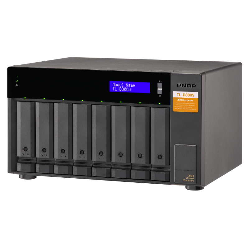 Obudowa dyskowa JBOD TL-D800S umożliwia tworzenie kopii zapasowych i rozbudowę systemu QNAP NAS, komputerów z systemem Windows® i Ubuntu® oraz serwerów. Model TL-D800S jest wyposażony w osiem 3,5-calowych zatok dyskowaych SATA 6 Gb/s, i oferuje kartę QXP PCIe do podłączania obudowy przy użyciu kabla SFF-8088 (lub SFF-8644). Zapewnia niezawodną wydajność odczytu/zapisu, umożliwiając płynne działanie pamięci masowej i tworzenie kopii zapasowych.