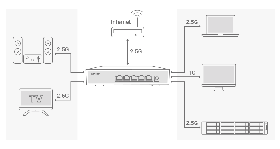 Modernizacja sieci nie powinna wiązać się z wielkimi kosztami, a łączność 2,5GbE zapewnia zauważalną poprawę w porównaniu ze standardową łącznością 1GbE. QSW-1105-5T to niezarządzany przełącznik z pięcioma portami 2,5GbE (wstecznie kompatybilny z 1G/100M) i obsługą kabli CAT5e, umożliwiając podłączanie wielu komputerów i NAS. Model QSW-1105-5T jest energooszczędny, cichy, działa na zasadzie „plug & play” oraz obsługuje wykrywanie i blokowanie pętli w celu zapewnienia prostego i efektywnego środowiska sieci o dużej prędkości.