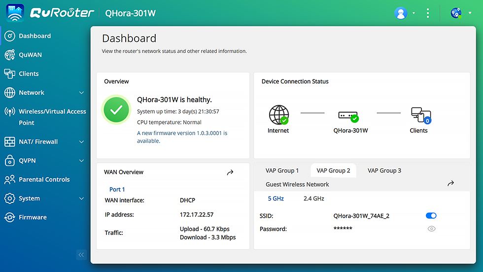 Urządzenie QHora-301W korzysta z OS QuRouter, dostarczając przyjazny w obsłudze, internetowy interfejs graficzny, przejrzysty pulpit nawigacyjny i wskaźniki portów, zapewniając pomoc w codziennych zadaniach w zakresie zarządzania siecią. Dzięki OS QuRouter użytkownicy mogą nie tylko efektywnie zarządzać wszystkimi urządzeniami podłączonymi przewodowo i bezprzewodowo w czasie rzeczywistym, ale także konfigurować zaporę sieciową, VPN, zabezpieczenia i zaawansowane funkcje QuWAN.