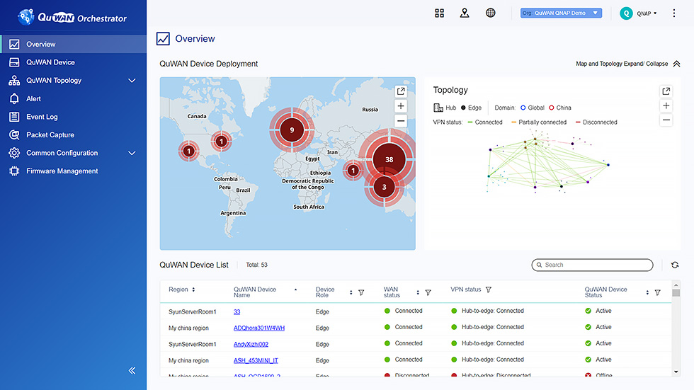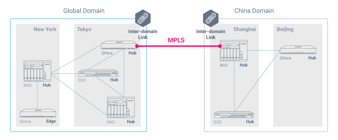 QuWAN pozwala na łatwe i elastyczne wdrożenie globalnej topologii sieci w celu usprawnienia pracy w wielu krajach. W ramach globalnej domeny można utworzyć wiele regionów, a skonfigurowane regionalne centra automatycznie utworzą sieć VPN Mesh poprzez publiczne adresy IP. Połączenia z domeną globalną poprzez łącze między domenami wymagają tylko chińskie domeny z ograniczeniami internetowymi