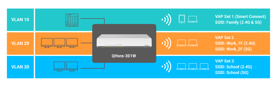 Urządzenie QHora-301W obsługuje korporacyjne punkty dostępu VAP (wirtualny punkt dostępu), pozwalając na uruchomienie do sześciu grup SSID (3 x 2,4 GHz i 3 x 5 GHz). Pracownicy IT mogą skonfigurować ustawienia VLAN dla każdego identyfikatora SSID, aby zapewnić grupom użytkowników/urządzeń stabilność połączenia, co jest niezbędne w sieciach o dużej gęstości i dużej liczbie jednoczesnych użytkowników.