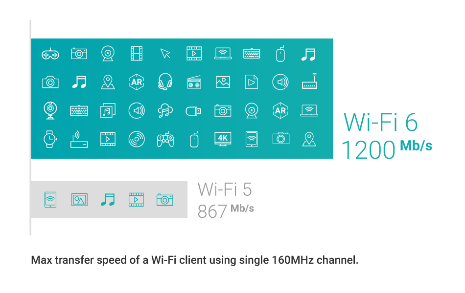 Obsługa dwupasmowej sieci Wi-Fi 6 802.11ax (2,4 GHz i 5 GHz), zapewniającej transfer z prędkością do 3600 Mb/s — 1,38 raza szybszy niż Wi-Fi 5 — oraz czterokrotnie większą liczbę jednoczesnych klientów Wi-Fi!