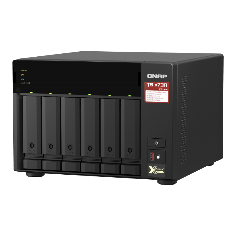 Model TS-673A jest zasilany przez czterordzeniowy procesor AMD Ryzen™ V1000 serii V1500 o taktowaniu 2,2 GHz z pamięcią RAM do 64 GB (obsługa pamięci ECC*) i wyposażony w porty USB 3.2 Gen 2 o szybkości do 10 Gb/s. Urządzenie TS-673A zapewnia także jeden port USB typu C w celu przesyłania dużych plików multimedialnych pomiędzy wieloma urządzeniami, zapewniając większą wydajność przepływu pracy.