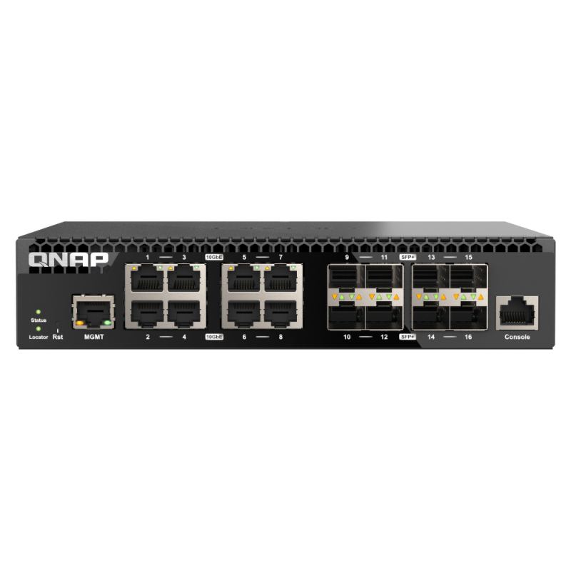 Model QSW-M3216R-8S8T jest wyposażony w osiem portów 10GbE SFP+ i osiem portów 10GbE RJ45, umożliwiając podłączanie różnych urządzeń i sieć wysokiej szybkości. Dzięki interfejsom SFP+ można użyć kabli miedzianych (DAC) do bezpośredniego podłączenia do urządzeń SFP+. Można także, przy użyciu portów RJ45 podłączać urządzenia 10GBASE-T/NBASE-T™ za pośrednictwem kabli RJ45 kategorii 6 (lub lepszej).
