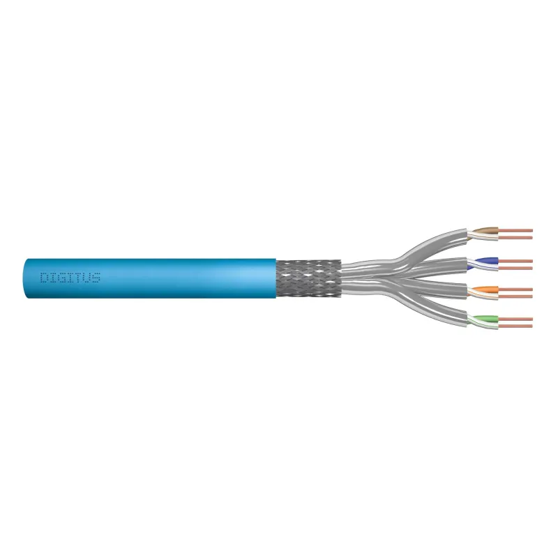 Rodzaj przewodu kabla - drut (100% CU) Zakres temperatury pracy: -20 °C do +50°C Powłoka zewnętrzna kabla LSOH AWG: 23/1 Kabel umożliwia stosowanie technologii PoE+ (Power over Ethernet) Do budowy tras okablowania klasy Ea, 500 MHz NVP: 79% CPR: Eca Kolor: Niebieski (RAL 5012) Izolacja: SFS-PE (Foam-Skin Polyethylene)