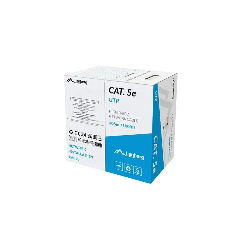 Kategoria teleinformatyczna Kat. 5/5e Rodzaj ekranowania U/UTP Materiał żyły Miedziowany (CCA) Materiał powłoki PVC Klasa odporności na ogień (Euroclass) Fca Typ przewodu Jednożyłowy Budowa żyły Jednożyłowe Grubość żyły 0.51 mm AWG 24 Izolacja HDPE 0.95 mm Grubość otuliny 0.5 mm Średnica zewnętrzna 5 mm Maksymalna częstotliwość pracy 100 MHz Długość przewodu 305 m Kolor Szary Zakres temperatury podczas użycia -20 - 75 °C