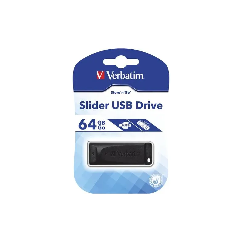 Pendrive Verbatim 64GB Slider USB 2.0 z kategorii pendrive. Standard pamięci: Flash, kolor: Czarny. Dysk USB Slider firmy Verbatim ma chowane złącze chroniące interfejs USB,gdy nie jest on używany.