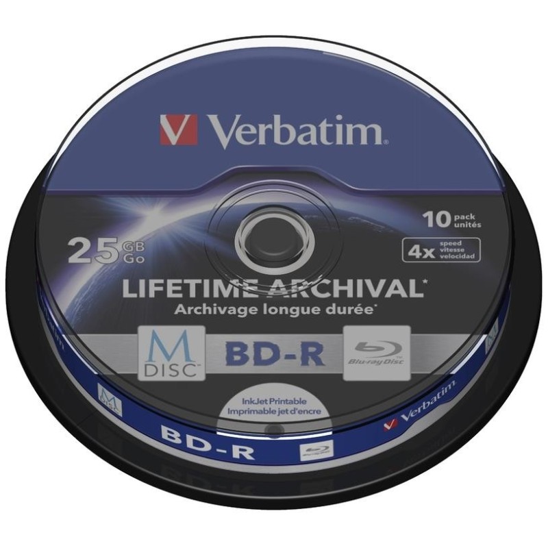 Płyty BD-R Verbatim M-Disc 25 GB 4x Print Cake 10 to płyta Blu-Ray. Oferuje dużą pojemność do archiwizacji danych i nagrywania filmów HD.