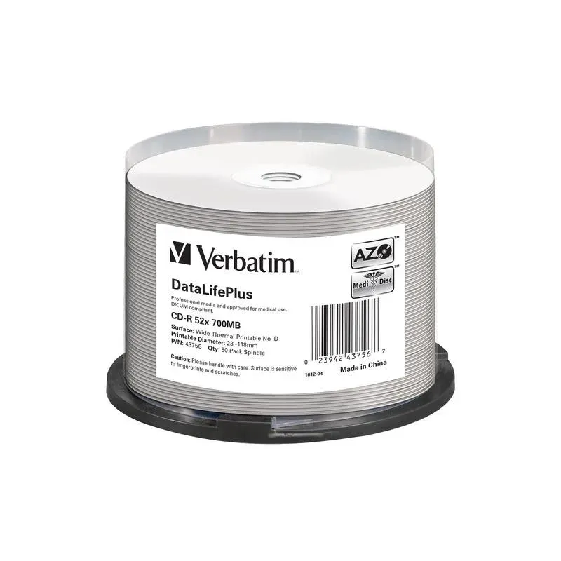 CDR VERBATIM 700MB DL+ AZO THERMAL PRINTABLE MEDI DISC (CAKE 50) NO ID DataLifePlus Profesjonalne optyczne nośniki danych są wykonane ze specyfikacji jeszcze bardziej rygorystycznych niż przewidziane przez aktualne standardy. Wyższe specyfikacje zapewniają większą kompatybilność z nagrywarkami i odtwarzaczami. Pozwala to zapewnić wyższą jakość nagrywania i dłuższy okres przechowywania plików, a także wyższą niezawodność. Profesjonalne nośniki optyczne marki Verbatim można rozpoznać po oznaczeniu DataLifePlus. Technologia AZO Technologia AZO zapewnia najwyższą odporność na promieniowanie UV, zwiększając poziom ochrony i niezawodności. Dzięki niej okres bezpiecznej archiwizacji wysokiej jakości zdjęć i dźwięku przekracza 100 lat. Drukowanie termiczne Płyty termiczne Verbatim umożliwiają nagrywanie zdjęć w wysokiej rozdzielczości oraz wyraźnych tekstów na całej powierzchni za pomocą drukarki termicznej. Szybkoschnąca powierzchnia zapewnia trwałość nadruków. Płyty termiczne są zgodne z drukarkami termicznymi z serii TEAC P55B & C, Rimage Everest 400 & 600 i Rimage Prism Plus. Pojemność: 700MB Prędkość: 52x Opakowanie: 50 Pack Spindle Powierzchnia: Wide Thermal Printable - Non ID Branded Obszar zapisywania: 23 - 118mm