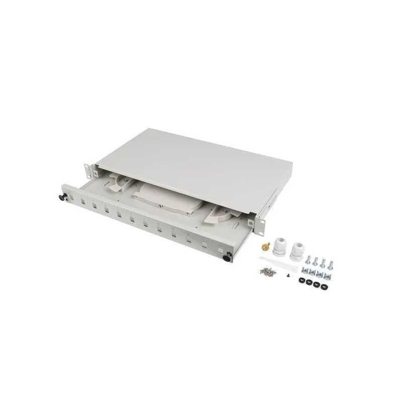 Przełącznica światłowodowa wysuwana z akcesoriami montażowymi o wysokości 1U to produkt przeznaczony do montażu wewnątrz szaf teleinformatycznych o szerokości 19". Wykonana została w całości z wytrzymałej blachy stalowej lakierowanej proszkowo. Panel przedni wyposażony został w numerację portów oraz otwory na śruby do epszego mocowania adapterów. Za pomocą przedniego panelu możemy wysunąć lub zdjąć szufladę przełącznicy, która zapewnia dobrą organizację oraz instalację kabli światłowodowych, dodatkowo panel tylny szuflady został wyposażony w 5 wejść kablowych. Uchwyty tzw. „uszy” rackowe są regulowane, co pozwala na bezproblemowe dopasowanie przełącznicy pod wymagania konkretnego użytkownika w szafie teleinformatycznej. - Pojemność przedniego panelu: 12xSC Simplex lub 12xLC Duplex, - Grubość blachy przełącznicy: 1.2mm, - Grubość uchwytów montażowych: 1.5mm, - Materiał wykonania kasety spawów oraz szpul: Tworzywo sztuczne (ABS), - Panel tylny wyposażony w 4 otwory o średnicy 22mm oraz 1 otwór na kable DROP, - Szuflada wyposażona w tacki spawów, uchwyty kablowe oraz przetłoczenia umożliwiające montaż przewodów za pomocą opasek zaciskowych.