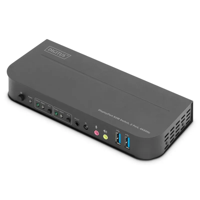 Obsługa 2 komputerów PC za pomocą klawiatury i myszy USB Zintegrowany hub USB z 2 portami USB 3.0 dla dodatkowych urządzeń Zewnętrzny odbiornik sygnału zdalnego sterowania w zestawie Kompatybilny z HDMI 2.0 / HDCP 2.2 / DisplayPort 1.2 / HDR / FreeSync Wskaźniki LED stanu i funkcji na panelu przednim Możliwy montaż na ścianie Plug and Play – nie wymaga sterowników Wejścia: 2x DisplayPort, 2x USB B (3.0), 2x wejście audio, 2x wyjście audio Wyjście: 1x DisplayPort, 1x HDMI, 1x wejście audio 1x wyjście audio, 2x USB A 2.0 Dodatkowe złącza z przodu: 2x USB A 3.0, 1x wejście audio 1x wyjście audio, odbiornik podczerwieni, wyjście IR Wejścia/wyjścia audio: Gniazda jack stereo 3,5mm Przednia strona LED: Power, 2x online, 2x wybór PC Przełącznik: włączanie/wyłączanie zasilania, przełączanie PC1/PC2 Wersja HDMI®: 2.0; Wersja HDCP: 2.2 / 1.4 Rozdzielczość UHD: 4096×2160p, 60Hz; Wersja DisplayPort: 1.2 Szerokość pasma DisplayPort: 32,4 Gbps wszystkie kanały (8,1 Gbps na kanał) Szerokość pasma HDMI®: 18 Gbps wszystkie kanały (6 Gbps na kanał) Głębia kolorów DisplayPort: 48Bit (wszystkie kanały), Obsługa HDR Głębia kolorów HDMI: 36Bit (wszystkie kanały), Obsługa HDR Zasilanie przełącznika KVM: 5V/3A