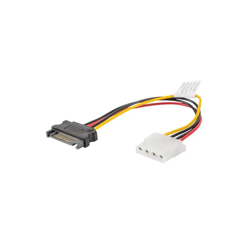 Kabel zasilający z Molex na SATA marki Lanberg to rozwiązanie dla wszystkich posiadaczy i użytkowników komputerów i/lub serwerów, którym brakuje wystarczającej ilości przewodów zasilania z końcówkami standardzie SATA. Produkt idealnie sprawdzi się wszędzie tam gdzie ilość przewodów z tym gniazdem jest zbyt mała, aby zasilić wszystkie urządzenia korzystające z tego rozwiązania. Dzięki wysokiej jakości wykonania oraz wprowadzeniu restrykcyjnych norm na etapie produkcji, kabel znajdzie zastosowanie u użytkowników szukających oferty dobrych jakościowo kabli. - Złącza: SATA, Molex, - Typ wtyczki 1: Molex 4-pin żeński, - Typ wtyczki 2: SATA 15-pin męski,