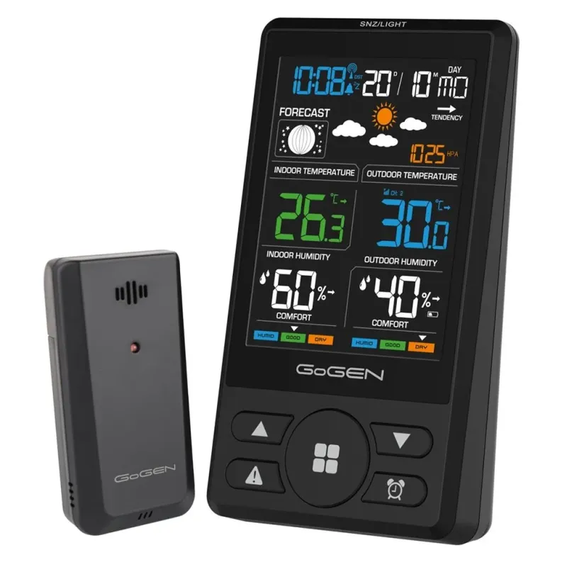 Prognoza pogody z animacją Wewnętrzna i zewnętrzna wilgotność powietrza Fazy Księżyca, Kalendarz, Budzik Ciśnienie barometryczne Możliwość podłączenia aż trzech zewnętrznych czujników Rozszerzona gwarancja do 4 lat Kompatybilny zewnętrzny czujnik: GOGMESENZOR15